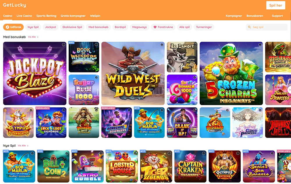 Get Lucky tilbyder et bredt og velafbalanceret udvalg af spil – fra klassiske slots- og jackpotspil til bordspil og live-casino. Spilleautomaterne rummer både populære titler fra anerkendte udviklere og forskellige tematiske varianter, herunder jackpots og MEGAWAYS-varianter, som gør spillet mere dynamisk.